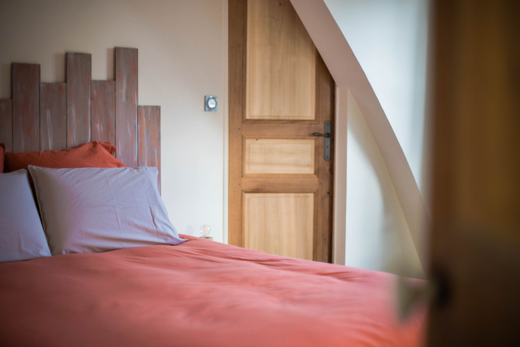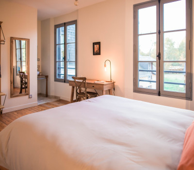 Chambre pour 2 à 3 personnes de 23m2, disposant d’un couchage de 160, d'un lit individuel, d’un dressing, d’un espace bureau et de son balcon en bois avec vue direct sur le parc de la maison.